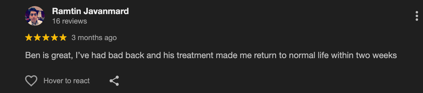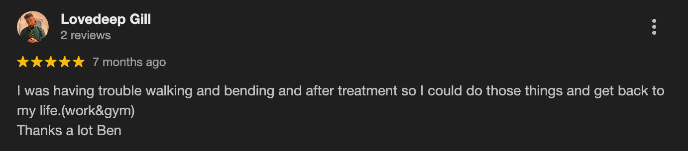 “Ben helped me with neck pain and upper back soreness… adjustments restored my range of motion. Very professional and pleasant.”
